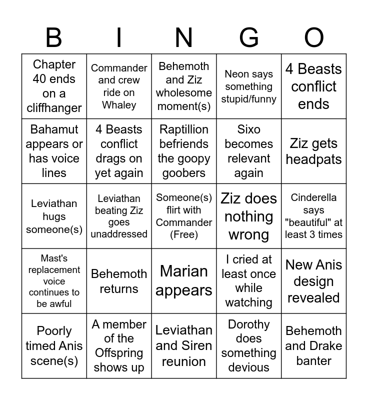 This bingo card has a free space and 24 words: Behemoth returns, A member of the Offspring shows up, Raptillion befriends the goopy goobers, Poorly timed Anis scene(s), 4 Beasts conflict ends, Chapter 40 ends on a cliffhanger, Bahamut appears or has voice lines, Commander and crew ride on Whaley, Ziz does nothing wrong, Marian appears, Sixo becomes relevant again, Leviathan hugs someone(s), I cried at least once while watching, New Anis design revealed, 4 Beasts conflict drags on yet again, Dorothy does something devious, Cinderella says "beautiful" at least 3 times, Behemoth and Ziz wholesome moment(s), Ziz gets headpats, Leviathan beating Ziz goes unaddressed, Behemoth and Drake banter, Mast's replacement voice continues to be awful, Neon says something stupid/funny and Leviathan and Siren reunion.