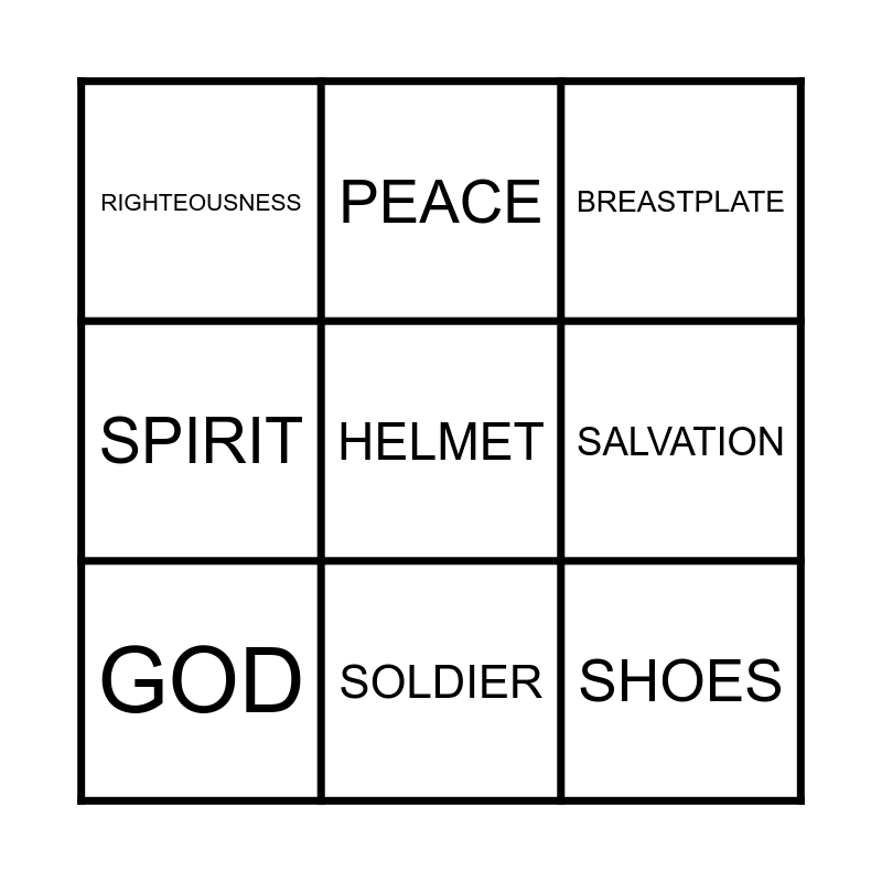 This bingo card has 16 words: BELT, TRUTH, BREASTPLATE, RIGHTEOUSNESS, SHOES, PEACE, SHIELD, FAITH, HELMET, SALVATION, SWORD, SPIRIT, ARMOR, SOLDIER, GOD and BATTLE.