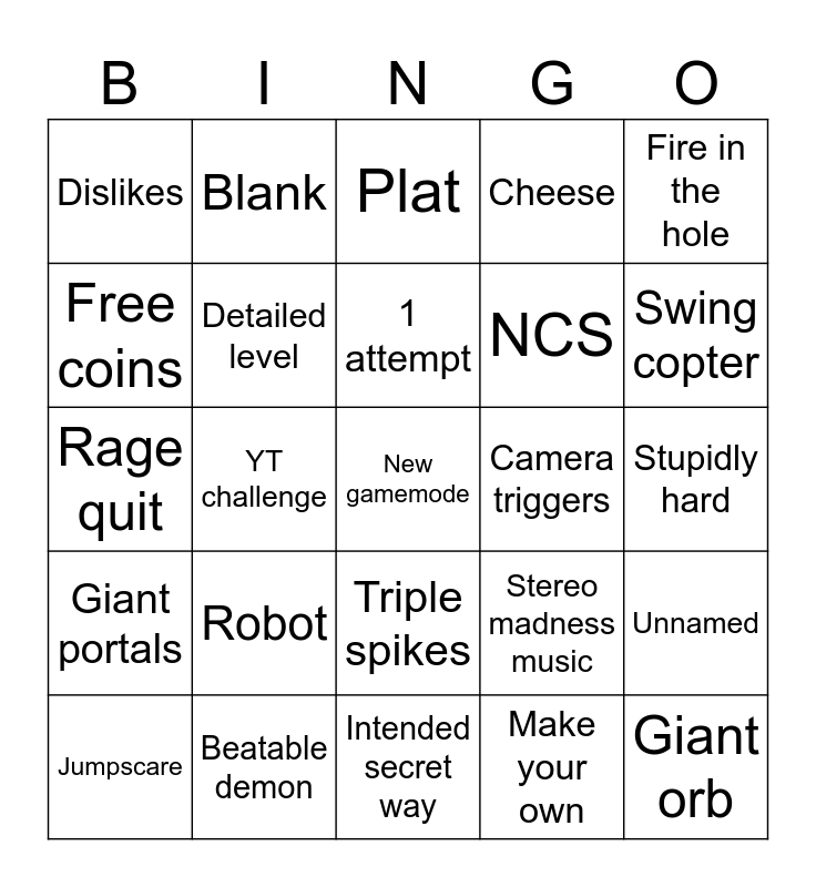 This bingo card has a free space and 24 words: Robot, Beatable demon, 1 attempt, Jumpscare, Fire in the hole, Dislikes, Free coins, Blank, Camera triggers, Triple spikes, NCS, Rage quit, Stereo madness music, Unnamed, Detailed level, Make your own, Stupidly hard, Plat, Swing copter, YT challenge, Giant orb, Giant portals, Cheese and Intended secret way.