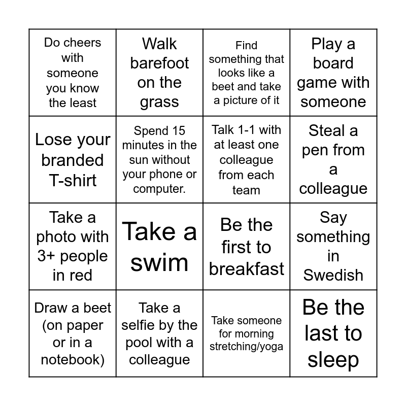 This bingo card has 16 words: Take a selfie by the pool with a colleague, Say something in Swedish, Find something that looks like a beet and take a picture of it, Do cheers with someone you know the least, Take a photo with 3+ people in red, Walk barefoot on the grass, Be the first to breakfast, Take someone for morning stretching/yoga, Lose your branded T-shirt, Spend 15 minutes in the sun without your phone or computer., Draw a beet (on paper or in a notebook), Play a board game with someone, Take a swim, Steal a pen from a colleague, Talk 1-1 with at least one colleague from each team and Be the last to sleep.