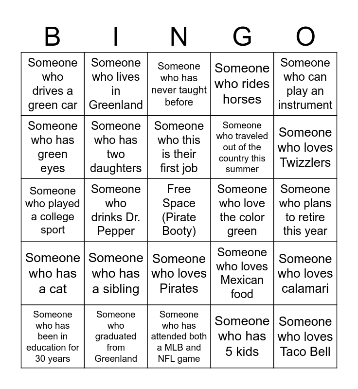 This bingo card has a free space and 24 words: Someone who has a sibling, Someone who graduated from Greenland, Someone who this is their first job, Someone who has been in education for 30 years, Someone who can play an instrument, Someone who drives a green car, Someone who has green eyes, Someone who lives in Greenland, Someone who love the color green, Someone who loves Pirates, Someone who traveled out of the country this summer, Someone who played a college sport, Someone who loves Mexican food, Someone who loves calamari, Someone who has two daughters, Someone who has 5 kids, Someone who plans to retire this year, Someone who has never taught before, Someone who loves Twizzlers, Someone who drinks Dr. Pepper, Someone who loves Taco Bell, Someone who has a cat, Someone who rides horses and Someone who has attended both a MLB and NFL game.