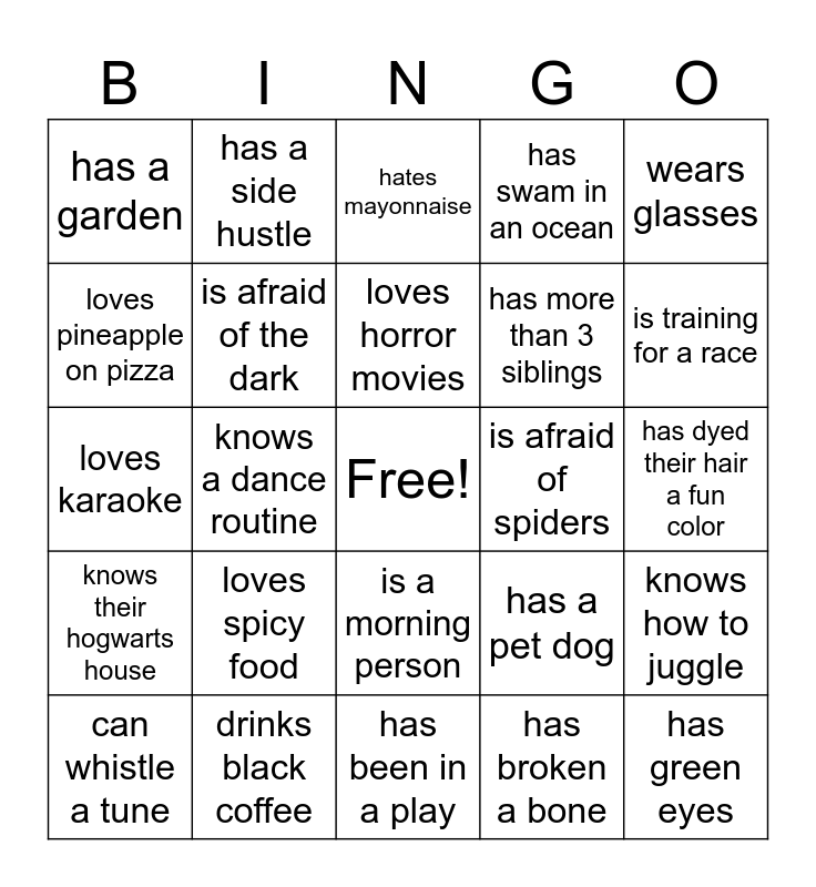 This bingo card has a free space and 24 words: loves spicy food, drinks black coffee, loves horror movies, can whistle a tune, wears glasses, has a garden, loves pineapple on pizza, has a side hustle, is afraid of spiders, is a morning person, has more than 3 siblings, loves karaoke, has a pet dog, knows how to juggle, is afraid of the dark, has broken a bone, has dyed their hair a fun color, hates mayonnaise, is training for a race, knows a dance routine, has green eyes, knows their hogwarts house, has swam in an ocean and has been in a play.