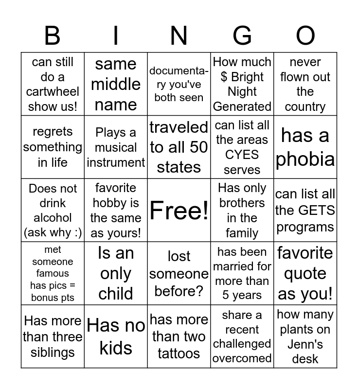 This bingo card has a free space and 24 words: Is an only child, Has no kids, traveled to all 50 states, Has more than three siblings, never flown out the country, can still do a cartwheel show us!, regrets something in life, same middle name, Has only brothers in the family, lost someone before?, can list all the areas CYES serves, Does not drink alcohol (ask why :), has been married for more than 5 years, favorite quote as you!, Plays a musical instrument, share a recent challenged overcomed, can list all the GETS programs, documenta-ry you've both seen, has a phobia, favorite hobby is the same as yours!, how many plants on Jenn's desk, met someone famous has pics = bonus pts, How much $ Bright Night Generated and has more than two tattoos.