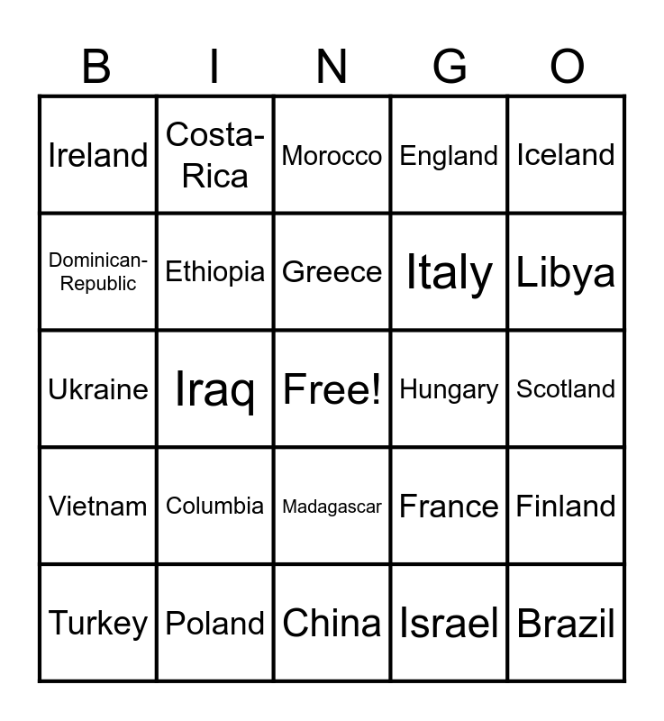 This bingo card has a free space and 50 words: Australia, Brazil, Canada, China, Columbia, Chile, Costa-Rica, Denmark, Dominican-Republic, Egypt, Ethiopia, England, Finland, France, Germany, Greenland, Greece, Hungary, Jamaica, Iceland, Iraq, Israel, Ireland, Italy, Japan, Kenya, Libya, Mexico, Morocco, Madagascar, Netherlands, New-Zealand, Nigeria, Norway, Poland, Philippines, Peru, Russia, Romania, Scotland, Spain, Sweden, Switzerland, Thailand, Turkey, Ukraine, United-States, Venezuela, Vietnam and Zimbabwe.