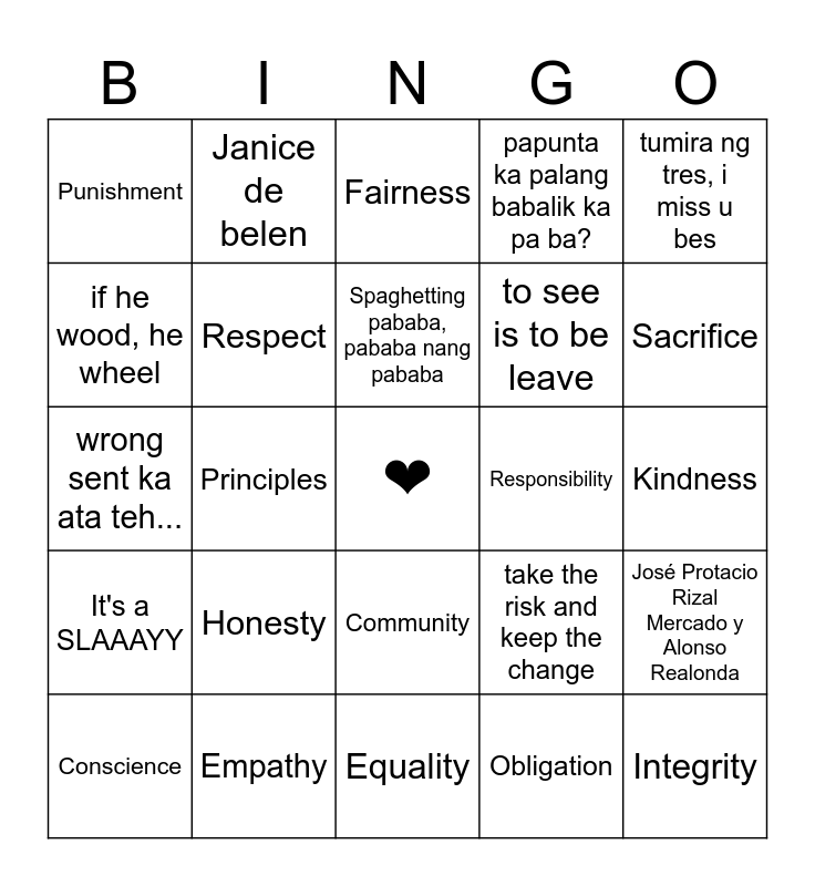 This bingo card has a free space and 29 words: Conscience, Development, Principles, Conventional, Punishment, Fairness, Respect, Honesty, Responsibility, Empathy, Kindness, Integrity, Equality, Obligation, Sacrifice, Understanding, Community, It's a SLAAAYY, tumira ng tres, i miss u bes, wrong sent ka ata teh..., take the risk and keep the change, nagkaon ka na lab?, to see is to be leave, if he wood, he wheel, papunta ka palang babalik ka pa ba?, Janice de belen, José Protacio Rizal Mercado y Alonso Realonda, Spaghetting pababa, pababa nang pababa and Chowking lauriat.