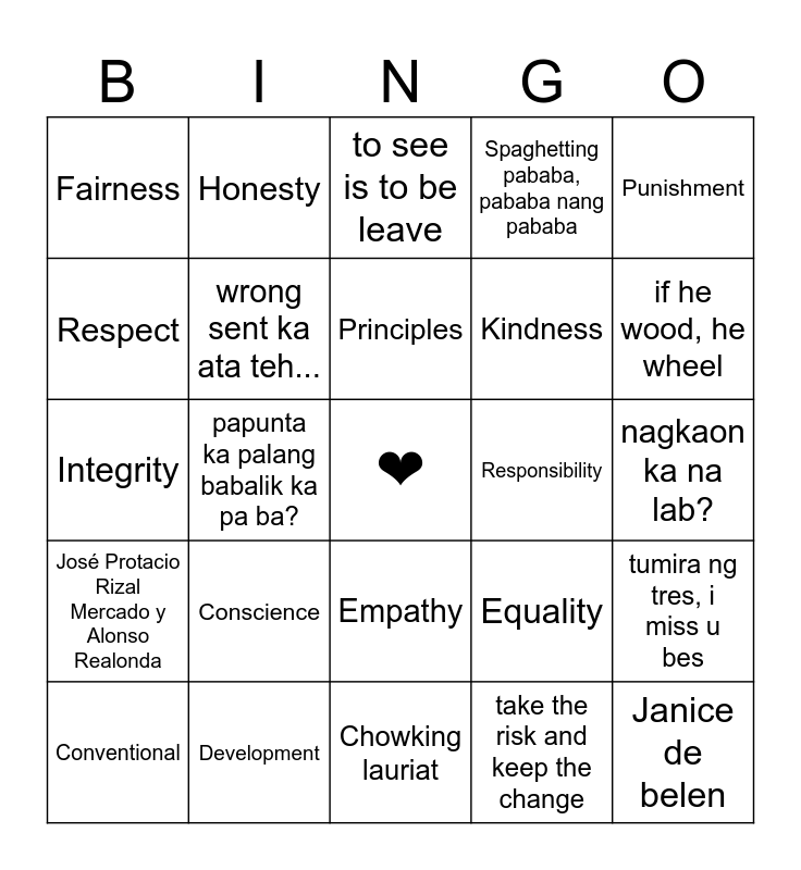This bingo card has a free space and 24 words: Conscience, Development, Principles, Conventional, Punishment, Fairness, Respect, Honesty, Responsibility, Empathy, Kindness, Integrity, Equality, tumira ng tres, i miss u bes, wrong sent ka ata teh..., take the risk and keep the change, nagkaon ka na lab?, to see is to be leave, if he wood, he wheel, papunta ka palang babalik ka pa ba?, Janice de belen, José Protacio Rizal Mercado y Alonso Realonda, Spaghetting pababa, pababa nang pababa and Chowking lauriat.