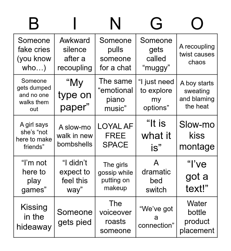 This bingo card has a free space and 24 words: “I didn’t expect to feel this way”, Someone gets pied, The same “emotional piano music”, Kissing in the hideaway, A recoupling twist causes chaos, Someone fake cries (you know who…), Someone gets dumped and no one walks them out, Awkward silence after a recoupling, “It is what it is”, The girls gossip while putting on makeup, “I just need to explore my options”, A girl says she’s “not here to make friends”, A dramatic bed switch, “I’ve got a text!”, “My type on paper”, “We’ve got a connection”, Slow-mo kiss montage, Someone pulls someone for a chat, A boy starts sweating and blaming the heat, A slow-mo walk in new bombshells, Water bottle product placement, “I’m not here to play games”, Someone gets called “muggy” and The voiceover roasts someone.
