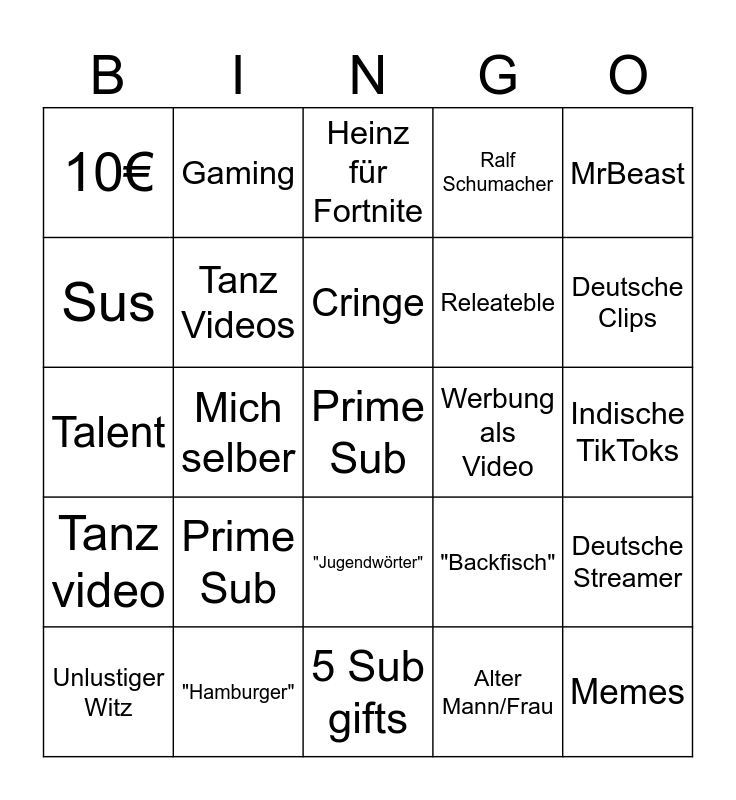 This bingo card has a free space and 24 words: Prime Sub, "Hamburger", Cringe, Unlustiger Witz, MrBeast, 10€, Sus, Gaming, Werbung als Video, "Jugendwörter", Releateble, Talent, "Backfisch", Deutsche Streamer, Tanz Videos, Alter Mann/Frau, Indische TikToks, Heinz für Fortnite, Deutsche Clips, Mich selber, Memes, Tanz video, Ralf Schumacher and 5 Sub gifts.