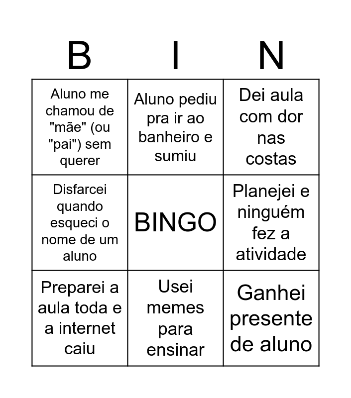 This bingo card has a free space and 25 words: Corrigi provas até tarde, Dei aula com dor de cabeça, Usei memes para ensinar, Tive que improvisar aula sem energia, Ganhei presente de aluno, Aluno me chamou de "mãe" (ou "pai") sem querer, Planejei e ninguém fez a atividade, Aluno pediu pra ir ao banheiro e sumiu, Esqueci o que ia falar no meio da explicação, Dei aula com dor na garganta, Levei lanche e não consegui comer, Terminei a aula e percebi que a calça estava suja de giz, Dei aula fora da minha área de formação, Escrevi no quadro e apaguei sem querer a parte importante, Preparei a aula toda e a internet caiu, Repeti a mesma explicação três vezes, Aluno me chamou pelo nome de outro professor, Dei aula com dor nas costas, Fui interrompido por barulho no corredor, Fiquei emocionado com o carinho de um aluno, Corrigi prova com letra ilegível, Esqueci o material didático em casa, Dei risada no meio da aula por causa de um comentário inusitado, Disfarcei quando esqueci o nome de um aluno and Fingi costume ao ser chamado de "tia/tio" na sala.