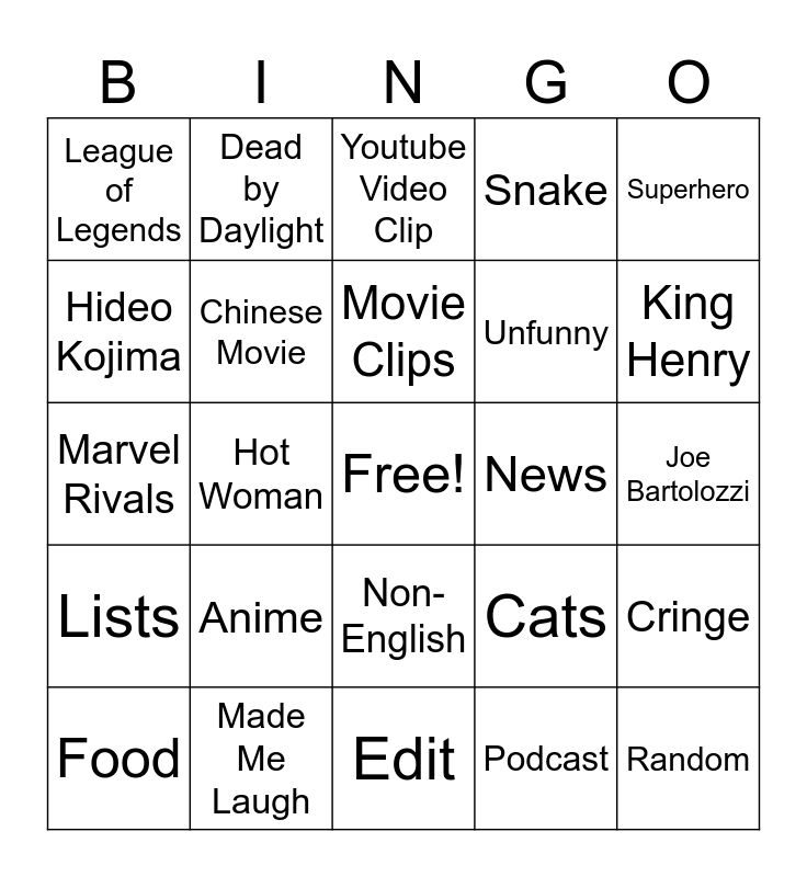 This bingo card has a free space and 24 words: Food, Anime, Movie Clips, Podcast, Superhero, League of Legends, Dead by Daylight, Youtube Video Clip, News, Joe Bartolozzi, Marvel Rivals, Chinese Movie, Cats, Cringe, Hideo Kojima, Made Me Laugh, Edit, Snake, King Henry, Lists, Hot Woman, Non-English, Unfunny and Random.