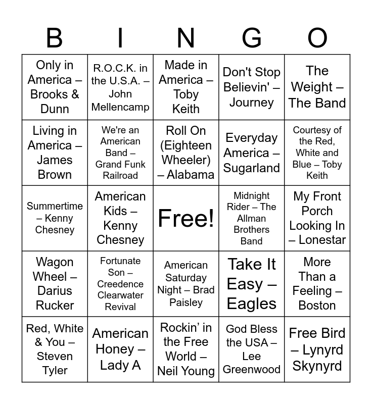This bingo card has a free space and 50 words: Sweet Home Alabama – Lynyrd Skynyrd, Free Bird – Lynyrd Skynyrd, Born in the U.S.A. – Bruce Springsteen, Rockin’ in the Free World – Neil Young, Fortunate Son – Creedence Clearwater Revival, American Girl – Tom Petty and the Heartbreakers, R.O.C.K. in the U.S.A. – John Mellencamp, Pink Houses – John Mellencamp, Living in America – James Brown, American Woman – The Guess Who, We're an American Band – Grand Funk Railroad, Don't Stop Believin' – Journey, More Than a Feeling – Boston, Take It Easy – Eagles, Life in the Fast Lane – Eagles, Old Time Rock and Roll – Bob Seger, Roll On (Eighteen Wheeler) – Alabama, Midnight Rider – The Allman Brothers Band, Ramblin' Man – The Allman Brothers Band, The Weight – The Band, American Kids – Kenny Chesney, God Bless the USA – Lee Greenwood, Only in America – Brooks & Dunn, Everyday America – Sugarland, Chicken Fried – Zac Brown Band, Where the Stars and Stripes and the Eagle Fly – Aaron Tippin, Courtesy of the Red, White and Blue – Toby Keith, American Soldier – Toby Keith, Made in America – Toby Keith, American Saturday Night – Brad Paisley, It's America – Rodney Atkins, This Is Country Music – Brad Paisley, Fly Over States – Jason Aldean, Back Where I Come From – Kenny Chesney, American Honey – Lady A, Something to Be Proud Of – Montgomery Gentry, My Town – Montgomery Gentry, Born Country – Alabama, Small Town USA – Justin Moore, My Front Porch Looking In – Lonestar, Homegrown – Zac Brown Band, Drunk on You – Luke Bryan, Springsteen – Eric Church, Red Dirt Road – Brooks & Dunn, Red, White & You – Steven Tyler, Summertime – Kenny Chesney, Sideways – Dierks Bentley, Beer Never Broke My Heart – Luke Combs, Wagon Wheel – Darius Rucker and Buy Me a Boat – Chris Janson.