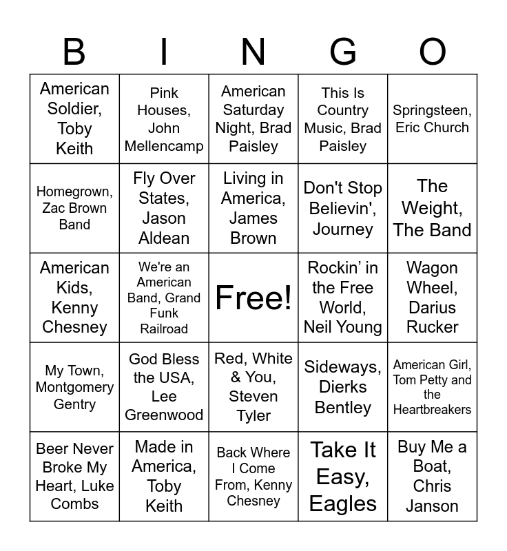 This bingo card has a free space and 50 words: Ramblin' Man, The Allman Brothers Band, Buy Me a Boat, Chris Janson, Fortunate Son, Creedence Clearwater Revival, Back Where I Come From, Kenny Chesney, God Bless the USA, Lee Greenwood, Small Town USA, Justin Moore, Pink Houses, John Mellencamp, Courtesy of the Red, White and Blue (The Angry American), Toby Keith, Homegrown, Zac Brown Band, Everyday America, Sugarland, Fly Over States, Jason Aldean, This Is Country Music, Brad Paisley, American Girl, Tom Petty and the Heartbreakers, Sideways, Dierks Bentley, Roll On (Eighteen Wheeler), Alabama, Born Country, Alabama, Living in America, James Brown, Rockin’ in the Free World, Neil Young, American Woman, The Guess Who, Springsteen, Eric Church, We're an American Band, Grand Funk Railroad, Take It Easy, Eagles, American Soldier, Toby Keith, Don't Stop Believin', Journey, Drunk on You, Luke Bryan, Free Bird, Lynyrd Skynyrd, The Weight, The Band, Life in the Fast Lane, Eagles, American Saturday Night, Brad Paisley, Red, White & You, Steven Tyler, Where the Stars and Stripes and the Eagle Fly, Aaron Tippin, More Than a Feeling, Boston, Summertime, Kenny Chesney, Chicken Fried, Zac Brown Band, Made in America, Toby Keith, Something to Be Proud Of, Montgomery Gentry, American Honey, Lady A, Midnight Rider, The Allman Brothers Band, Born in the U.S.A., Bruce Springsteen, Wagon Wheel, Darius Rucker, My Front Porch Looking In, Lonestar, R.O.C.K. in the U.S.A., John Mellencamp, Sweet Home Alabama, Lynyrd Skynyrd, Only in America, Brooks & Dunn, Beer Never Broke My Heart, Luke Combs, American Kids, Kenny Chesney, Old Time Rock and Roll, Bob Seger, Red Dirt Road, Brooks & Dunn, My Town, Montgomery Gentry and It's America, Rodney Atkins.