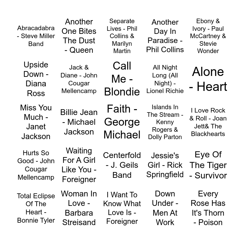 This bingo card has 66 words: Physical - Olivia Newton-John, Bette Davis Eyes - Kim Carnes, Endless Love - Diana Ross & Lionel Richie, Eye Of The Tiger - Survivor, Every Breath You Take - The Police, Flashdance... What A Feeling - Irene Cara, Another One Bites The Dust - Queen, Say Say Say - Paul McCartney & Michael Jackson, Call Me - Blondie, Lady - Kenny Rogers, Centerfold - J. Geils Band, (Just Like) Starting Over - John Lennon, I Love Rock & Roll - Joan Jett& The Blackhearts, Ebony & Ivory - Paul McCartney & Stevie Wonder, That's What Friends Are For - Dionne Warwick, Upside Down - Diana Ross, Billie Jean - Michael Jackson, Abracadabra - Steve Miller Band, Say You, Say Me - Lionel Richie, All Night Long (All Night) - Lionel Richie, Waiting For A Girl Like You - Foreigner, Hurts So Good - John Cougar Mellencamp, Another Day In Paradise - Phil Collins, Do That To Me One More Time - Captain & Tenille, Like A Virgin - Madonna, When Doves Cry - Prince, Maneater - Hall & Oates, Another Brick In The Wall (Part II) - Pink Floyd, Faith - George Michael, Crazy Little Thing Called Love - Queen, Total Eclipse Of The Heart - Bonnie Tyler, Careless Whisper - George Michael, Walk Like An Egyptian - The Bangles, Don't You Want Me - The Human League, Jessie's Girl - Rick Springfield, Woman In Love -Barbara Streisand, Hard To Say I'm Sorry - Chicago, Miss You Much - Janet Jackson, Down Under - Men At Work, We Are The World - USA For Africa, Jack & Diane - John Cougar Mellencamp, Jump - Van Halen, Islands In The Stream - Kenny Rogers & Dolly Parton, Coming Up - Paul McCartney & Wings, Arthur's Theme (Best That You Can Do) - Christopher Cross, Broken Wings - Mr. Mister, Alone - Heart, Can't Fight This Feeling - REO Speedwagon, Every Rose Has It's Thorn - Poison, I Wanna Dance With Somebody (Who Loves Me) - Whitney Houston, I Can't Go For That (No Can Do) - Hall & Oates, Livin' On A Prayer - Bon Jovi, Money For Nothing - Dire Straits, On My Own - Patti LaBelle & Michael McDonald, Beat It - Michael Jackson, Crazy For You - Madonna, What's Love Got To Do With It - Tina Turner, Rock With You - Michael Jackson, Separate Lives - Phil Collins & Marilyn Martin, I Want To Know What Love Is - Foreigner, It's Still Rock & Roll To Me - Billy Joel, Look Away - Chicago, Footloose - Kenny Loggins, Roll With It - Steve Winwood, Straight Up - Paula Abdul and Against All Odds (Take A Look At Me Now) - Phil Collins.