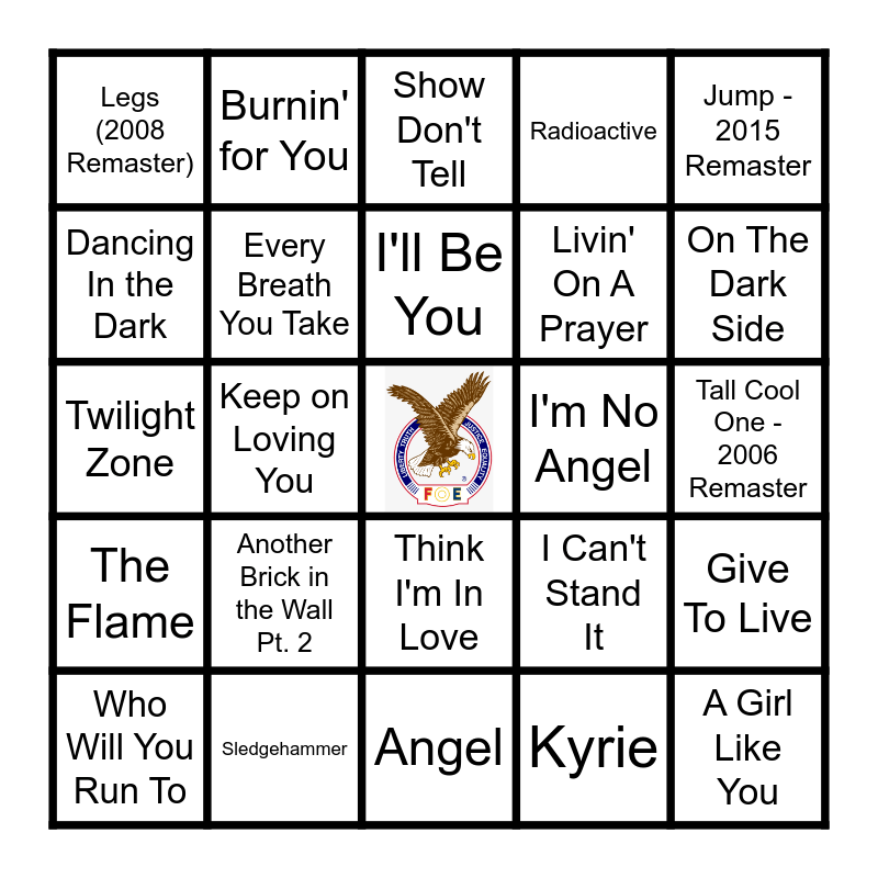 This bingo card has a free space and 52 words: (Just Like) Starting Over - Remastered 2010, A Girl Like You, All She Wants To Do Is Dance, Angel, Another Brick in the Wall Pt. 2, Back In Black, Burnin' for You, Caught Up In You, Dancing In the Dark, Don't Let Him Know, Every Breath You Take, Fantasy, Give To Live, I Can't Stand It, I Still Haven't Found What I'm Looking For, If I'd Been The One, I'll Be You, I'm No Angel, Invisible Touch, Jump - 2015 Remaster, Keep on Loving You, Kyrie, Legs (2008 Remaster), Livin' On A Prayer, Lonely Ol' Night, Money for Nothing, New World Man, No Way Out, On The Dark Side, Orange Crush - Remastered 2013, Owner of a Lonely Heart, Radioactive, Rockin' in the Free World, Shake It Up, Shock The Monkey, Show Don't Tell, Sledgehammer, Start Me Up, Stop Draggin' My Heart Around, Talk to Me, Talking In Your Sleep (2023 Remaster), Tall Cool One - 2006 Remaster, The Flame, The Voice, Think I'm In Love, Touch of Grey, Tunnel of Love, Twilight Zone, Urgent, While You See A Chance, Who Will You Run To and Working for the Weekend.