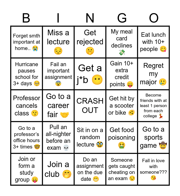 This bingo card has a free space and 24 words: Pull an all-nighter before an exam ๐, Join a club ๐คญ, Get a j*b ๐ถ, Join or form a study group ๐, Eat lunch with 10+ people ๐, Forget smth important at home.. ๐ญ, Hurricane pauses school for 3+ days ๐ฅบ, Miss a lecture๐, Get hit by a scooter or bike ๐ซจ, Sit in on a random lecture ๐ฅธ, Gain 10+ extra credit points ๐, Professor cancels class ๐, Get food poisoning ๐คฎ, Go to a sports game ๐ค , Fail an important assignment ๐จ, Someone gets caught cheating on an exam ๐, Become friends with at least 1 person from each college ๐, Get rejected ๐คซ, Regret my major ๐ฅฒ, Go to a career fair ๐ค, Fall in love with someone??? ๐, Go to a professorโs office hours 3+ times ๐ค, My meal card declines ๐ธ and Do an assignment on the due date ๐ฌ.