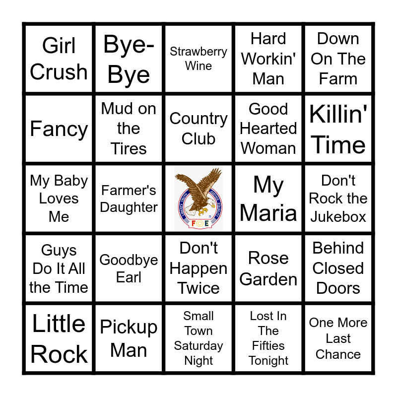 This bingo card has a free space and 63 words: Alibis, Any Man Of Mine, Be My Baby Tonight, Behind Closed Doors, Boot Scootin' Boogie, Bubba Shot The Jukebox, Bye-Bye, Chattahoochee, Country Club, Daddy's Money, Don't Happen Twice, Don't Let Our Love Start Slippin' Away, Don't Rock the Jukebox, Down On The Farm, Dust On The Bottle, Fancy, Farmer's Daughter, Girl Crush, God Blessed Texas, Good Hearted Woman, Goodbye Earl, Guys Do It All the Time, Hard Workin' Man, Heads Carolina Tails California, Here You Come Again, Here's a Quarter (Call Someone Who Cares), I Swear, I Think About You, I Try to Think About Elvis, I'm Gonna Be Somebody, Indian Outlaw, It's A Little Too Late, John Deere Green, Just Got Started Lovin' You, Killin' Time, Little Rock, Lookin' for Love, Lost In The Fifties Tonight, Maybe It Was Memphis, Mud on the Tires, My Baby Loves Me, My Maria, Need You Now, No One Else On Earth, One More Last Chance, Pickup Man, Real Wild Child (Wild One), Rose Garden, She Don't Know She's Beautiful, She's In Love With The Boy, Should've Been A Cowboy, Small Town Saturday Night, Sold (The Grundy County Auction Incident), Some Girls Do, Song of the South, Strawberry Wine, Suds in the Bucket, Sweet Southern Comfort, The Fireman, The Happiest Girl In The Whole U.S.A., Watermelon Crawl, What Part of No and Wink.