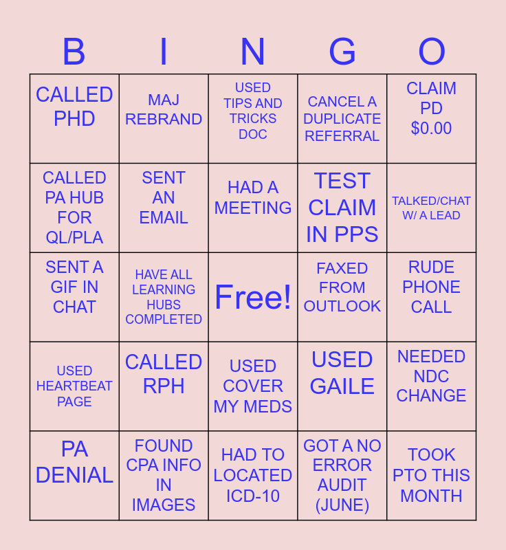This bingo card has a free space and 24 words: PA DENIAL, CALLED RPH, HAD A MEETING, GOT A NO ERROR AUDIT (JUNE), CLAIM PD $0.00, CALLED PHD, MAJ REBRAND, USED TIPS AND TRICKS DOC, FAXED FROM OUTLOOK, RUDE PHONE CALL, SENT A GIF IN CHAT, SENT AN EMAIL, USED GAILE, NEEDED NDC CHANGE, CALLED PA HUB FOR QL/PLA, FOUND CPA INFO IN IMAGES, HAD TO LOCATED ICD-10, CANCEL A DUPLICATE REFERRAL, TALKED/CHAT W/ A LEAD, USED HEARTBEAT PAGE, HAVE ALL LEARNING HUBS COMPLETED, USED COVER MY MEDS, TEST CLAIM IN PPS and TOOK PTO THIS MONTH.