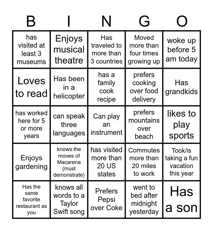 This bingo card has 40 words: Celebrating birthday this month (July), has worked here for 5 or more years, eats spinach by choice, Has been in a helicopter, knows all words to a Taylor Swift song, has visited more than 20 US states, has a family cook recipe, has a cat, woke up before 5 am today, Enjoys gardening, can speak three languages, Moved more than four times growing up, Can play an instrument, likes to play sports, prefers mountains over beach, knows the moves of Macarena (must demonstrate), more than 3 siblings, has visited at least 3 museums, Collects something (what is it?), Has traveled to more than 3 countries, Took/is taking a fun vacation this year, went to bed after midnight yesterday, prefers cooking over food delivery, Loves to read, is left handed, has a dog, Drives a red car, Favorite candy is M&Ms, Has a son, Has a daughter, This is their first job after school, Has the same favorite restaurant as you, Eats pineapple on pizza (ew.), Commutes more than 20 miles to work, Has grandkids, Prefers Pepsi over Coke, Has been to Disney in the past year, Ate Chinese food this week, Enjoys musical theatre and Has a pet that is not a cat or dog.