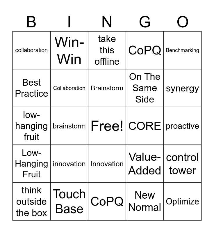 This bingo card has a free space and 64 words: All on the same page, Circle Back, From My Perspective, New Normal, Proactive, Think Outside the Box, Win-Win, Drill Down, CORE, CLW, Low-Hanging Fruit, ROI, Value-Added, Benchmarking, Data-Driven, Collaboration, Brainstorm, CoPQ, Out of Flow, Best Practice, Touch Base, Innovation, On The Same Side, Optimize, all on the same page, circle back, from my perspective, new normal, proactive, think outside the box, win-win, drill down, CORE, CLW, low-hanging fruit, ROI, value-added, benchmarking, data-driven, collaboration, brainstorm, CoPQ, out of flow, best practice, Touch base, innovation, on the same side, optimize, synergy, leverage, actionable, agile, KPI, control tower, stakeholder, bandwidth, take this offline, pivot, table this, dropping the ball, move the needle, close the loop, quick win and defect.
