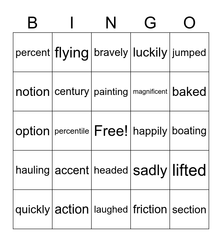 This bingo card has a free space and 24 words: accent, action, painting, quickly, jumped, percent, notion, flying, happily, headed, magnificent, option, sadly, lifted, century, friction, boating, bravely, baked, percentile, section, hauling, luckily and laughed.