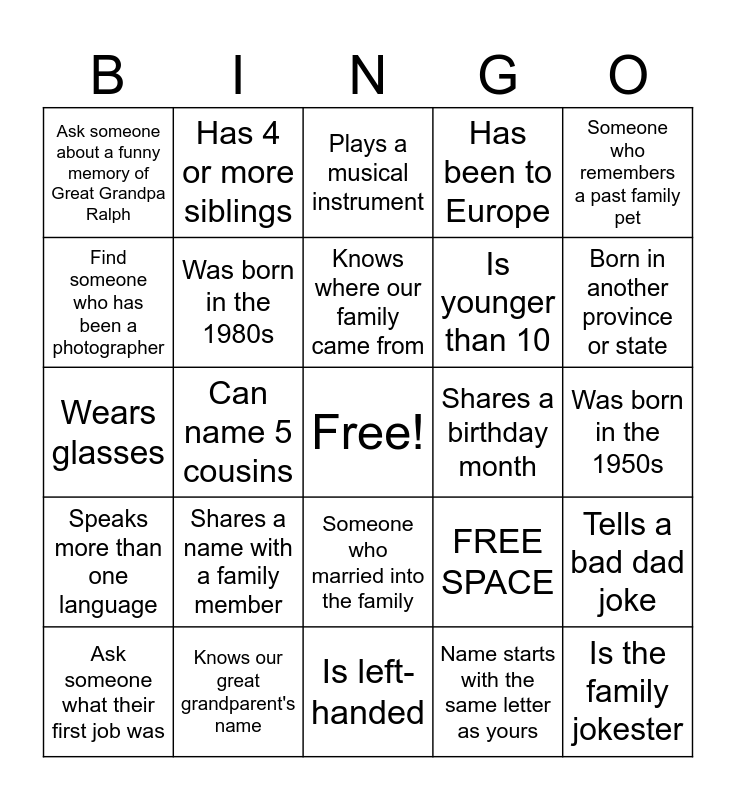 This bingo card has a free space and 24 words: Shares a name with a family member, Knows our great grandparent's name, Knows where our family came from, Ask someone what their first job was, Someone who remembers a past family pet, Ask someone about a funny memory of Great Grandpa Ralph, Find someone who has been a photographer, Has 4 or more siblings, Shares a birthday month, Someone who married into the family, Is younger than 10, Wears glasses, FREE SPACE, Tells a bad dad joke, Was born in the 1980s, Name starts with the same letter as yours, Was born in the 1950s, Plays a musical instrument, Born in another province or state, Can name 5 cousins, Is the family jokester, Speaks more than one language, Has been to Europe and Is left-handed.