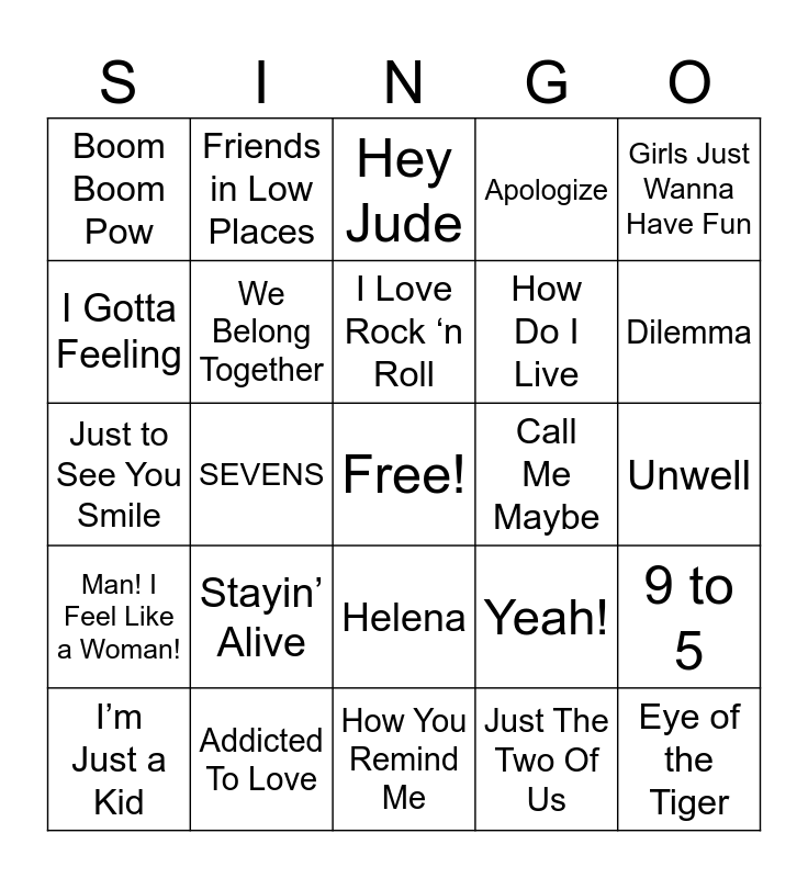 This bingo card has a free space and 50 words: Every Rose Has Its Thorn, Addicted To Love, My Girl, Just The Two Of Us, 9 to 5, Jolene, Friends in Low Places, The Twist, How Do I Live, Party Rock Anthem, I Gotta Feeling, We Belong Together, Yeah!, Eye of the Tiger, Low, Rolling in the Deep, Hey Jude, Call Me Maybe, I Will Always Love You, Boom Boom Pow, Stayin’ Alive, How You Remind Me, Apologize, Dilemma, You’re Still the One, Billie Jean, I Love Rock ‘n Roll, You’re So Vain, Girls Just Wanna Have Fun, Man! I Feel Like a Woman!, The Thunder Rolls, Play That Funky Music, Hotel California, My Boyfriend’s Back, I Got You Babe, Don’t Stop Believin’, Baby One More Time, Don’t Rock the Jukebox, My Maria, Just to See You Smile, Delta Dawn, You Look So Good in Love, Sugar, We're Goin Down, Sk8er Boi, I’m Just a Kid, SEVENS, Helena, I Fall Apart, Unwell and Save Me.