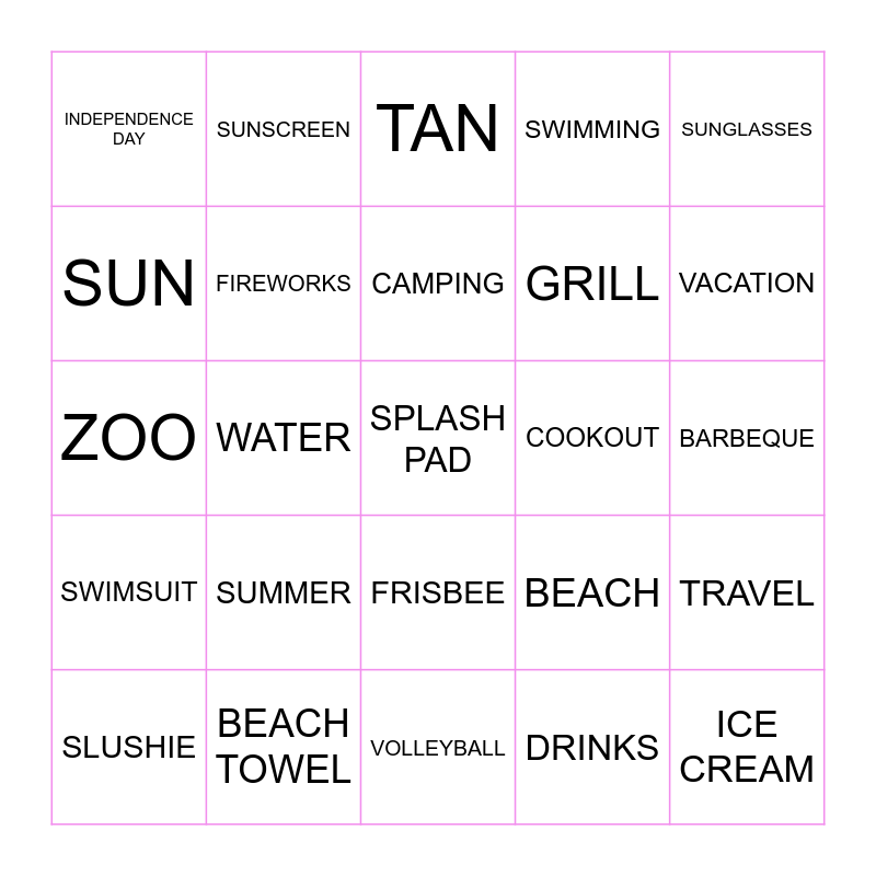 This bingo card has 25 words: SWIMSUIT, BEACH TOWEL, SPLASH PAD, DRINKS, SUNGLASSES, INDEPENDENCE DAY, SUNSCREEN, TAN, COOKOUT, TRAVEL, SUN, FIREWORKS, VOLLEYBALL, BEACH, VACATION, SLUSHIE, WATER, CAMPING, GRILL, BARBEQUE, ZOO, SUMMER, FRISBEE, SWIMMING and ICE CREAM.