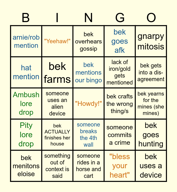 This bingo card has a free space and 24 words: bek ACTUALLY finishes her house, something out of context is said, bek mentions our bingo, bek menitons eloise, gnarpy mitosis, arnie/rob mention, hat mention, "Yeehaw!", bek crafts the wrong thing/s, someone breaks the 4th wall, lack of iron/gold gets mentioned, Ambush lore drop, someone commits a crime, bek goes hunting, bek farms, "bless your heart", bek yearns for the mines (she mines), bek overhears gossip, bek gets into a dis-agreement, someone uses an alien device, bek uses a device, Pity lore drop, bek goes afk and someone rides in a horse and cart.