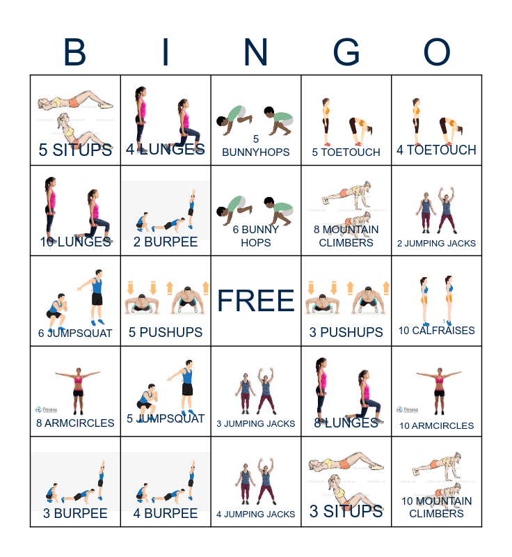 This bingo card has 24 images, a free space and 24 words: 3 BURPEE, 5 JUMPSQUAT, 6 BUNNY HOPS, 3 SITUPS, 4 TOETOUCH, 5 SITUPS, 4 LUNGES, 5 BUNNYHOPS, 3 PUSHUPS, 10 CALFRAISES, 6 JUMPSQUAT, 2 BURPEE, 8 LUNGES, 10 ARMCIRCLES, 10 LUNGES, 4 BURPEE, 4 JUMPING JACKS, 5 TOETOUCH, 2 JUMPING JACKS, 8 ARMCIRCLES, 5 PUSHUPS, 3 JUMPING JACKS, 8 MOUNTAIN CLIMBERS and 10 MOUNTAIN CLIMBERS.