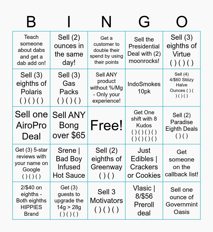 This bingo card has a free space and 24 words: Srene | Bad Boy Infused Hot Sauce, Get (3) guests to upgrade the 14g > 28g ( ) ( ) ( ), Sell ANY product without %/Mg - Only your experience!, 2/$40 on eighths - Both eighths HIPPIES Brand, Sell (3) eighths of Virtue ( ) ( ) ( ), Teach someone about dabs and get a dab add on!, Sell (3) eighths of Polaris ( ) ( ) ( ), Sell (2) ounces in the same day!, Get One shift with 8 Kudos ( ) ( ) ( ) ( ) ( ) ( ) ( ) ( ), Sell (2) eighths of Greenway ( ) ( ), IndoSmokes 10pk, Sell one AiroPro Deal, Just Edibles | Crackers or Cookies, Get someone on the callback list!, Sell (3) Gas Packs ( ) ( ) ( ), Vlasic | 8/$56 Preroll deal, Sell (2) Paradise Eighth Deals ( ) ( ), Get a customer to double their spend by using their points, Sell (4) 4/$60 Stiiizy Halve Ounces ( ) ( ) ( ) ( ), Sell ANY Bong over $65, Sell one ounce of Governmint Oasis, Get (3) 5-star reviews with your name on Google ( ) ( ) ( ), Sell the Presidential Deal with (2) moonrocks! and Sell 3 Motivators ( ) ( ) ( ).