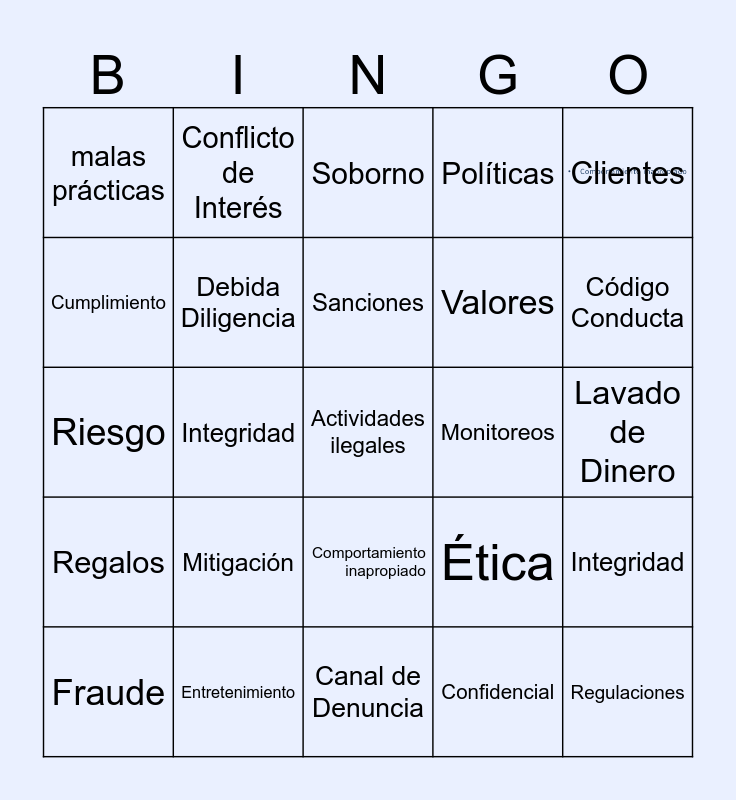 This bingo card has 2 images, a free space and 27 words: Ética, Corrupción, Valores, Canal de Denuncia, Cumplimiento, Soborno, Conflicto de Interés, Regalos, Monitoreos, Integridad, Riesgo, Políticas, Fraude, Entretenimiento, Código Conducta, Transparencia, Debida Diligencia, Sanciones, Mitigación, malas prácticas, Lavado de Dinero, Confidencial, Integridad, Regulaciones, Comportamiento inapropiado, Clientes and proveedores.