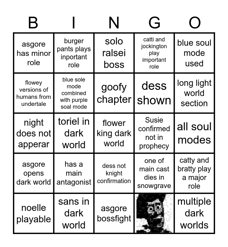 This bingo card has 1 images, a free space and 23 words: has a main antagonist, sans in dark world, goofy chapter, noelle playable, blue soul mode used, asgore has minor role, flowey versions of humans from undertale, burger pants plays inportant role, Susie confirmed not in prophecy, dess not knight confirmation, dess shown, night does not apperar, one of main cast dies in snowgrave, catty and bratty play a major role, blue sole mode combined with purple soal mode, all soul modes, solo ralsei boss, long light world section, toriel in dark world, multiple dark worlds, asgore opens dark world, catti and jockington play important role and asgore bossfight.