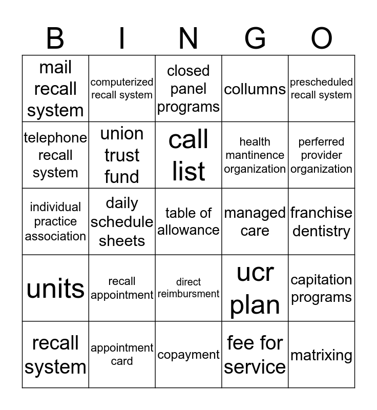 This bingo card has a free space and 24 words: recall appointment, appointment card, call list, recall system, prescheduled recall system, mail recall system, telephone recall system, computerized recall system, managed care, direct reimbursment, health mantinence organization, individual practice association, ucr plan, capitation programs, union trust fund, fee for service, franchise dentistry, closed panel programs, perferred provider organization, daily schedule sheets, matrixing, units, collumns and copayment.