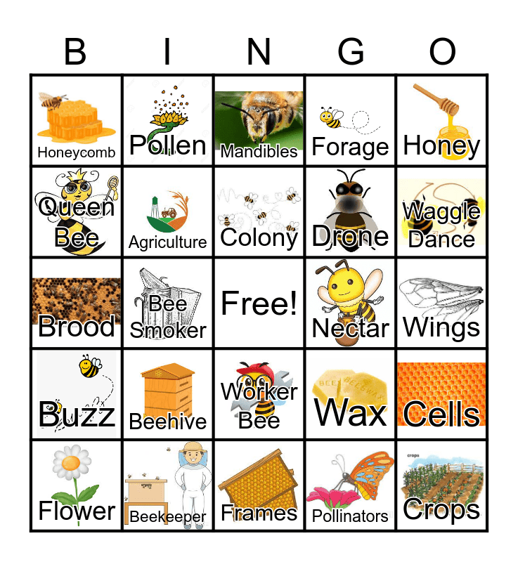 This bingo card has 24 images, a free space and 24 words: Beehive, Beekeeper, Colony, Flower, Honey, Honeycomb, Queen Bee, Pollen, Nectar, Worker Bee, Drone, Brood, Wax, Cells, Agriculture, Pollinators, Wings, Mandibles, Waggle Dance, Bee Smoker, Crops, Buzz, Forage and Frames.