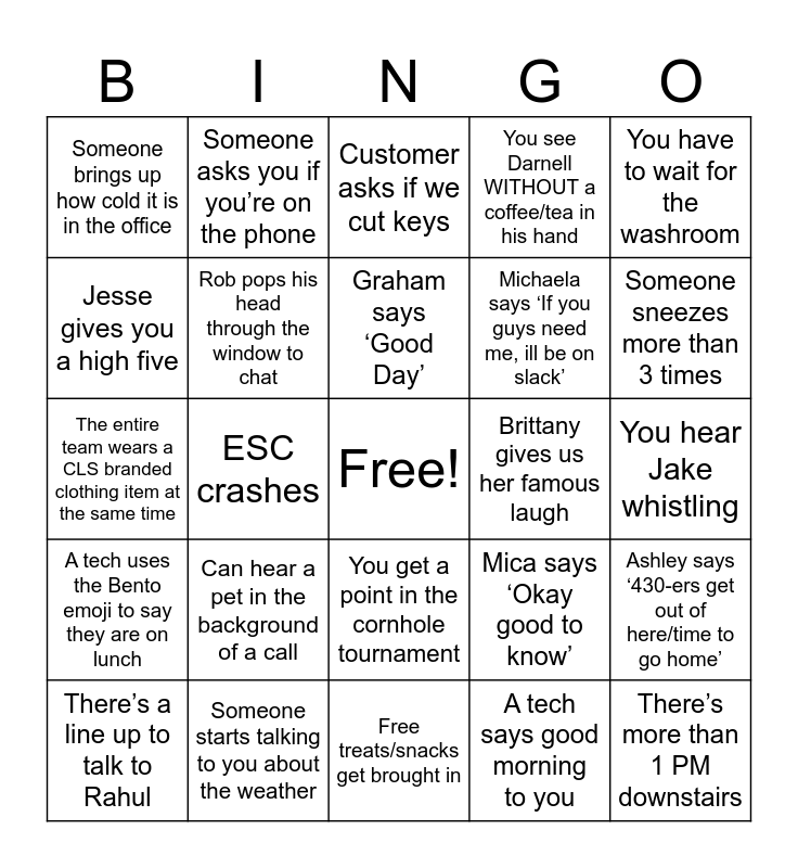 This bingo card has a free space and 25 words: Can hear a pet in the background of a call, Free treats/snacks get brought in, Graham says ‘Good Day’, There’s a line up to talk to Rahul, You have to wait for the washroom, Someone brings up how cold it is in the office, Jesse gives you a high five, Someone asks you if you’re on the phone, Brittany gives us her famous laugh, You get a point in the cornhole tournament, Michaela says ‘If you guys need me, ill be on slack’, The entire team wears a CLS branded clothing item at the same time, Mica says ‘Okay good to know’, Ashley says ‘430-ers get out of here/time to go home’, Rob pops his head through the window to chat, Someone uses a GIF from the TV show The Office, You hear Jake whistling, Customer asks if we cut keys, Someone sneezes more than 3 times, ESC crashes, There’s more than 1 PM downstairs, Someone starts talking to you about the weather, A tech uses the Bento emoji to say they are on lunch, You see Darnell WITHOUT a coffee/tea in his hand and A tech says good morning to you.
