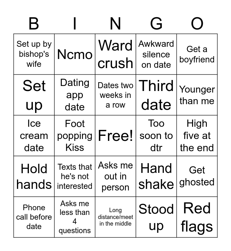 This bingo card has a free space and 28 words: Get ghosted, Second date, Third date, Stood up, Set up, Ward crush, Ncmo, Hold hands, Too soon to dtr, Phone call before date, Ice cream date, Awkward silence on date, Asks me less than 4 questions, Long distance/meet in the middle, Younger than me, Double date, Texts that he's not interested, Dating app date, Dates two weeks in a row, Asks me out in person, Set up by bishop's wife, Great conversation, Red flags, Foot popping Kiss, High five at the end, Hand shake, Get a boyfriend and "Wanna hang out?".