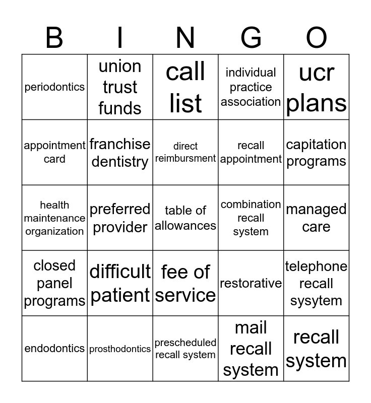 This bingo card has a free space and 24 words: difficult patient, prosthodontics, direct reimbursment, endodontics, ucr plans, periodontics, appointment card, union trust funds, combination recall system, fee of service, recall appointment, health maintenance organization, restorative, telephone recall sysytem, franchise dentistry, mail recall system, managed care, call list, capitation programs, preferred provider, recall system, closed panel programs, individual practice association and prescheduled recall system.