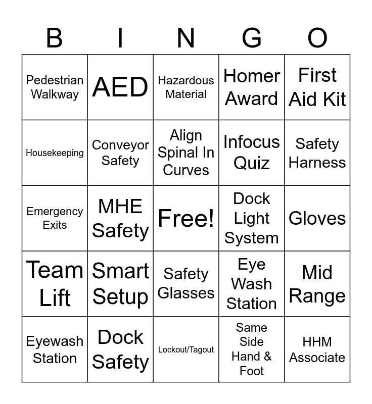 This bingo card has a free space and 42 words: Point Your Toe & Go, Align Spinal In Curves, Green Zone, Smart Setup, Same Side Hand & Foot, Mid Range, HHM Associate, Hydrate, Hazardous Material, Safety Glasses, Gloves, Safety Harness, MHE Safety, First Aid Kit, Honk Horn, Eye Wash Station, Fire Extinguisher, Emergency Exits, PPE, AED, Housekeeping, Stop Signs, Reenergizers, Pedestrian Walkway, Safety Blade, Home Depot, Infocus Quiz, Safety Matters, Safety Takes Everyone, Got Your Back, Bravo Card, Team Lift, Conveyor Safety, Lockout/Tagout, Slips & Trips, Eyewash Station, Dock Safety, Dock Light System, Spotlight, Homer, Homer Award and Safety Data Sheet.