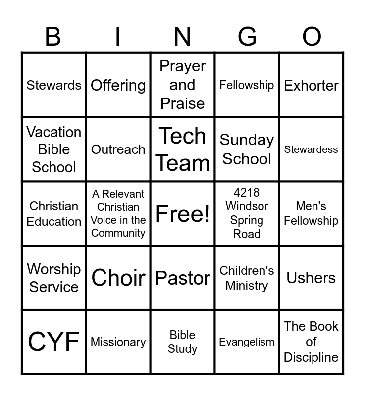 This bingo card has a free space and 24 words: Choir, Missionary, Tech Team, CYF, Exhorter, Stewards, Vacation Bible School, Offering, 4218 Windsor Spring Road, Pastor, Sunday School, Christian Education, Children's Ministry, Ushers, Outreach, Evangelism, Men's Fellowship, Prayer and Praise, Stewardess, A Relevant Christian Voice in the Community, The Book of Discipline, Worship Service, Fellowship and Bible Study.