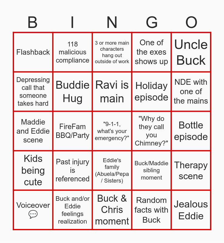This bingo card has a free space and 24 words: Past injury is referenced, Buck and/or Eddie feelings realization, Ravi is main, Voiceover 💬, Uncle Buck, Flashback, Depressing call that someone takes hard, 118 malicious compliance, "Why do they call you Chimney?", Eddie's family (Abuela/Pepa / Sisters), Holiday episode, Maddie and Eddie scene, Buck/Maddie sibling moment, Therapy scene, Buddie Hug, Random facts with Buck, Bottle episode, 3 or more main characters hang out outside of work, NDE with one of the mains, FireFam BBQ/Party, Jealous Eddie, Kids being cute, One of the exes shows up and Buck & Chris moment.