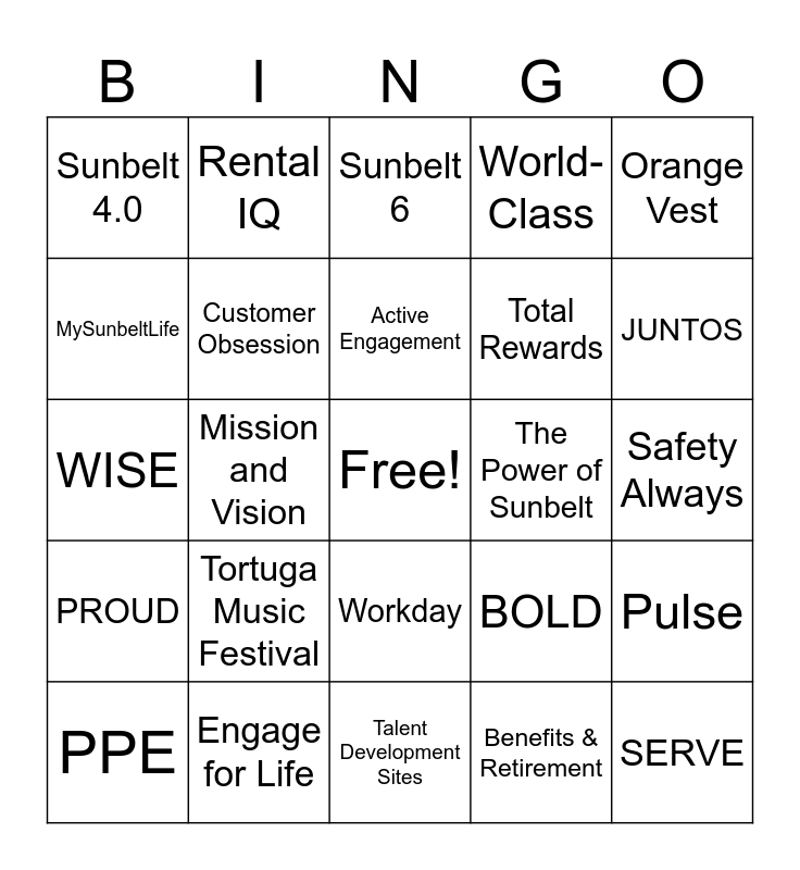 This bingo card has a free space and 24 words: Tortuga Music Festival, Engage for Life, Active Engagement, PPE, Orange Vest, Sunbelt 4.0, MySunbeltLife, Rental IQ, The Power of Sunbelt, Workday, Total Rewards, WISE, BOLD, Pulse, Customer Obsession, Benefits & Retirement, Safety Always, Sunbelt 6, JUNTOS, Mission and Vision, SERVE, PROUD, World-Class and Talent Development Sites.