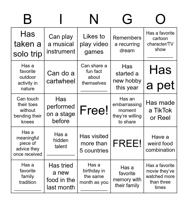 This bingo card has a free space and 25 words: Has a hidden talent __________, Has a birthday in the same month as you __________, Can share a fun fact about themselves __________, Has a favorite family tradition __________, Has a favorite cartoon character/TV show __________, Has taken a solo trip, Has a favorite outdoor activity in nature, Can play a musical instrument, Has an embarrassing moment they’re willing to share, Has visited more than 5 countries, Has started a new hobby this year, Can touch their toes without bending their knees, FREE!, Have a weird food combination, Can do a cartwheel, Has run a marathon before, Has made a TikTok or Reel, Likes to play video games, Has a pet, Has performed on a stage before, Has a favorite movie they’ve watched more than three times, Has tried a new food in the last month, Has a meaningful piece of advice they once received, Remembers a recurring dream and Has a favorite memory with their family.
