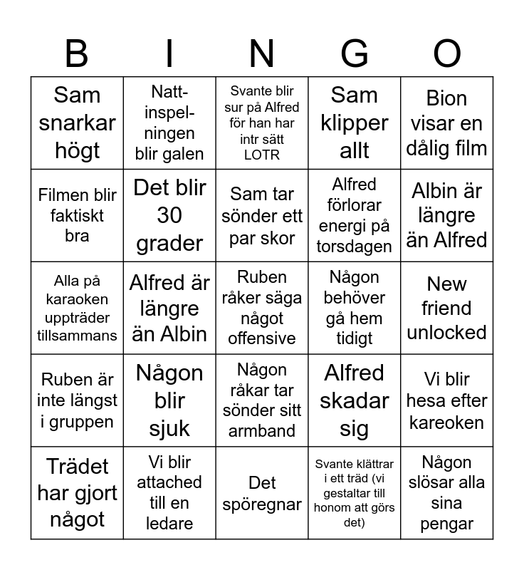 This bingo card has 25 words: Någon blir sjuk, Det spöregnar, Sam tar sönder ett par skor, Trädet har gjort något, Bion visar en dålig film, Sam snarkar högt, Filmen blir faktiskt bra, Natt- inspel- ningen blir galen, Någon behöver gå hem tidigt, Någon råkar tar sönder sitt armband, Alfred förlorar energi på torsdagen, Alla på karaoken uppträder tillsammans, Alfred skadar sig, Vi blir hesa efter kareoken, Det blir 30 grader, Någon slösar alla sina pengar, New friend unlocked, Svante blir sur på Alfred för han har intr sätt LOTR, Albin är längre än Alfred, Alfred är längre än Albin, Ruben råker säga något offensive, Vi blir attached till en ledare, Ruben är inte längst i gruppen, Sam klipper allt and Svante klättrar i ett träd (vi gestaltar till honom att görs det).