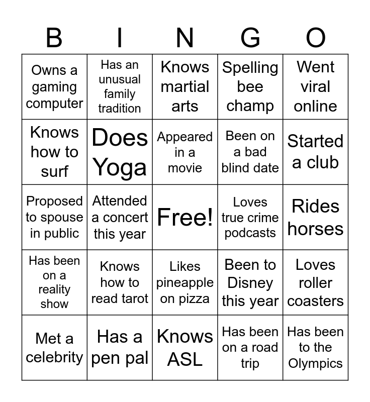 This bingo card has a free space and 25 words: Knows how to read tarot, Knows ASL, Appeared in a movie, Met a celebrity, Went viral online, Owns a gaming computer, Knows how to surf, Has an unusual family tradition, Loves true crime podcasts, Likes pineapple on pizza, Been on a bad blind date, Proposed to spouse in public, Been to Disney this year, Loves roller coasters, Does Yoga, Can do a cartwheel, Rides horses, Knows martial arts, Started a club, Attended a concert this year, Has been to the Olympics, Has a pen pal, Has been on a reality show, Spelling bee champ and Has been on a road trip.
