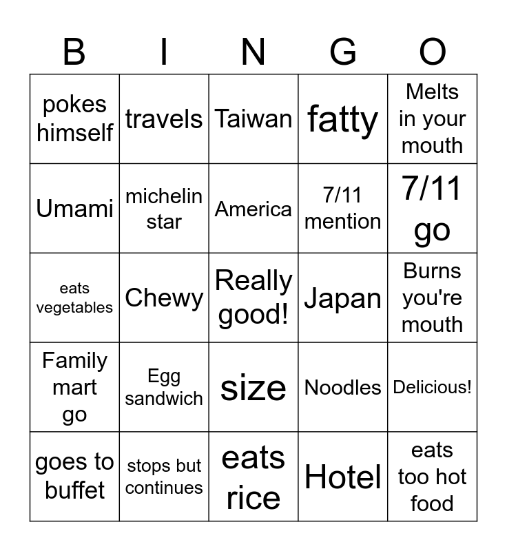 This bingo card has a free space and 24 words: Egg sandwich, stops but continues, America, goes to buffet, Melts in your mouth, pokes himself, Umami, travels, Japan, size, 7/11 mention, eats vegetables, Noodles, Delicious!, michelin star, Hotel, Burns you're mouth, Taiwan, 7/11 go, Chewy, eats too hot food, Family mart go, fatty and eats rice.