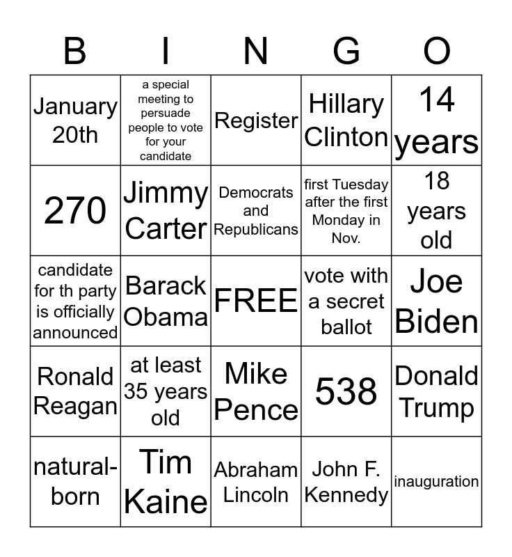 This bingo card has a free space and 24 words: at least 35 years old, Tim Kaine, Democrats and Republicans, natural-born, 14 years, January 20th, 270, a special meeting to persuade people to vote for your candidate, vote with a secret ballot, Mike Pence, first Tuesday after the first Monday in Nov., candidate for th party is officially announced, 538, Donald Trump, Jimmy Carter, John F. Kennedy, Joe Biden, Register, 18 years old, Barack Obama, inauguration, Ronald Reagan, Hillary Clinton and Abraham Lincoln.
