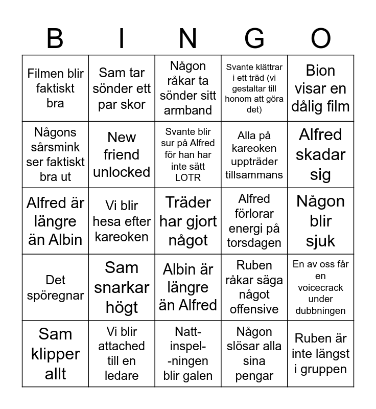 This bingo card has 25 words: Sam snarkar högt, Natt- inspel- -ningen blir galen, Svante blir sur på Alfred för han har inte sätt LOTR, Sam klipper allt, Bion visar en dålig film, Filmen blir faktiskt bra, Någons sårsmink ser faktiskt bra ut, Sam tar sönder ett par skor, Alfred förlorar energi på torsdagen, Albin är längre än Alfred, Alla på kareoken uppträder tillsammans, Alfred är längre än Albin, Ruben råkar säga något offensive, En av oss får en voicecrack under dubbningen, New friend unlocked, Ruben är inte längst i gruppen, Någon blir sjuk, Någon råkar ta sönder sitt armband, Alfred skadar sig, Vi blir hesa efter kareoken, Träder har gjort något, Vi blir attached till en ledare, Det spöregnar, Svante klättrar i ett träd (vi gestaltar till honom att göra det) and Någon slösar alla sina pengar.