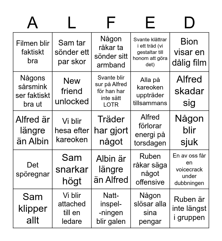 This bingo card has 25 words: Sam snarkar högt, Natt- inspel- -ningen blir galen, Svante blir sur på Alfred för han har inte sätt LOTR, Sam klipper allt, Bion visar en dålig film, Filmen blir faktiskt bra, Någons sårsmink ser faktiskt bra ut, Sam tar sönder ett par skor, Alfred förlorar energi på torsdagen, Albin är längre än Alfred, Alla på kareoken uppträder tillsammans, Alfred är längre än Albin, Ruben råkar säga något offensive, En av oss får en voicecrack under dubbningen, New friend unlocked, Ruben är inte längst i gruppen, Någon blir sjuk, Någon råkar ta sönder sitt armband, Alfred skadar sig, Vi blir hesa efter kareoken, Träder har gjort något, Vi blir attached till en ledare, Det spöregnar, Svante klättrar i ett träd (vi gestaltar till honom att göra det) and Någon slösar alla sina pengar.