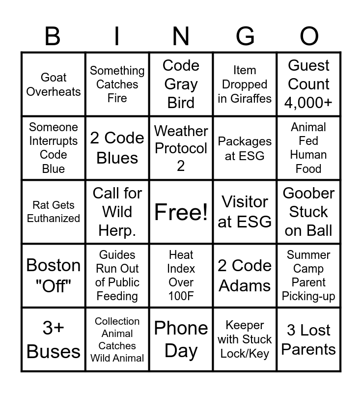 This bingo card has a free space and 33 words: Hot Mess on Radio, Wristband Color Called, Call for Wild Herp., Security Misses a Radio Call, Boston "Off", 2 Code Blues, Guest Count 4,000+, 3+ Buses, Something Catches Fire, 4 Code Blues, Weather Protocol 2, Code Gray Bird, Weather Protocol 1, Call for Wild Bird, Visitor at ESG, Animal Fed Human Food, Collection Animal Catches Wild Animal, Rat Gets Euthanized, Guides Run Out of Public Feeding, 2 Code Adams, Heat Index Over 100F, RV in Parking Lot, Goat Overheats, Goober Stuck on Ball, Phone Day, 3 Lost Parents, Item Dropped in Giraffes, Packages at ESG, Someone Interrupts Code Blue, Summer Camp Parent Picking-up, 6 Code Blues, Keeper with Stuck Lock/Key and LSS Emergency.