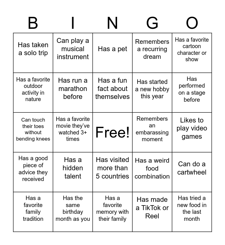 This bingo card has a free space and 24 words: Has a hidden talent ⠀⠀⠀⠀⠀⠀⠀, Has the same birthday month as you ⠀⠀⠀⠀⠀⠀⠀, Has a fun fact about themselves ⠀⠀⠀⠀⠀⠀⠀, Has a favorite family tradition ⠀⠀⠀⠀⠀⠀⠀, Has a favorite cartoon character or show ⠀⠀⠀⠀⠀⠀⠀, Has taken a solo trip ⠀⠀⠀⠀⠀⠀⠀, Has a favorite outdoor activity in nature ⠀⠀⠀⠀⠀⠀⠀, Can play a musical instrument ⠀⠀⠀⠀⠀⠀⠀, Remembers an embarassing moment ⠀⠀⠀⠀⠀⠀⠀, Has visited more than 5 countries ⠀⠀⠀⠀⠀⠀⠀, Has started a new hobby this year ⠀⠀⠀⠀⠀⠀⠀, Can touch their toes without bending knees ⠀⠀⠀⠀⠀⠀⠀, Has a weird food combination ⠀⠀⠀⠀⠀⠀⠀, Can do a cartwheel ⠀⠀⠀⠀⠀⠀⠀, Has run a marathon before ⠀⠀⠀⠀⠀⠀⠀, Has made a TikTok or Reel ⠀⠀⠀⠀⠀⠀⠀, Likes to play video games ⠀⠀⠀⠀⠀⠀⠀, Has a pet ⠀⠀⠀⠀⠀⠀⠀, Has performed on a stage before ⠀⠀⠀⠀⠀⠀⠀, Has a favorite movie they’ve watched 3+ times ⠀⠀⠀⠀⠀⠀⠀, Has tried a new food in the last month ⠀⠀⠀⠀⠀⠀⠀, Has a good piece of advice they received ⠀⠀⠀⠀⠀⠀⠀, Remembers a recurring dream ⠀⠀⠀⠀⠀⠀⠀ and Has a favorite memory with their family ⠀⠀⠀⠀⠀⠀⠀.